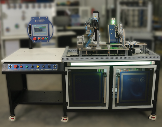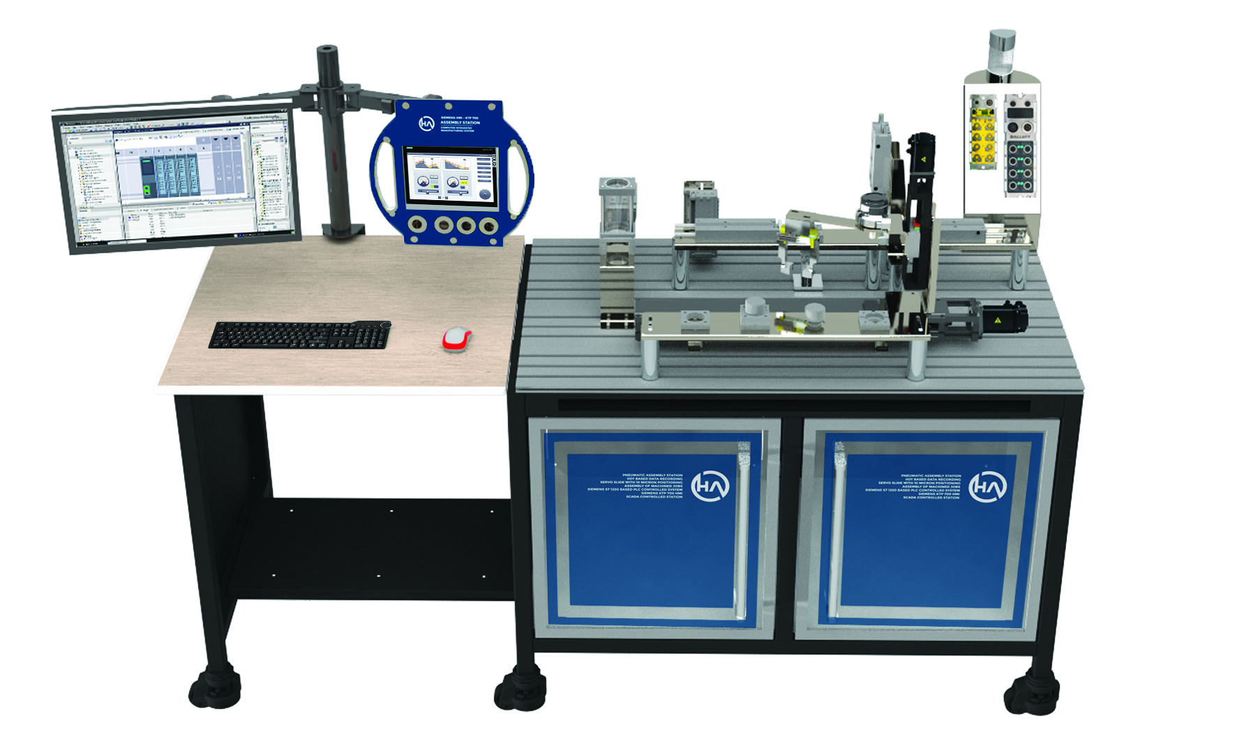 Hytech Didactic Assembly Station is a mechatronics based training system designed to carry out automated assembly of 4 different parts with pneumatically and electrically actuated process. Automated bearing dispensing station is also provided in the system. Entire station is programmed and operated with SIEMENS PLC and HMI.