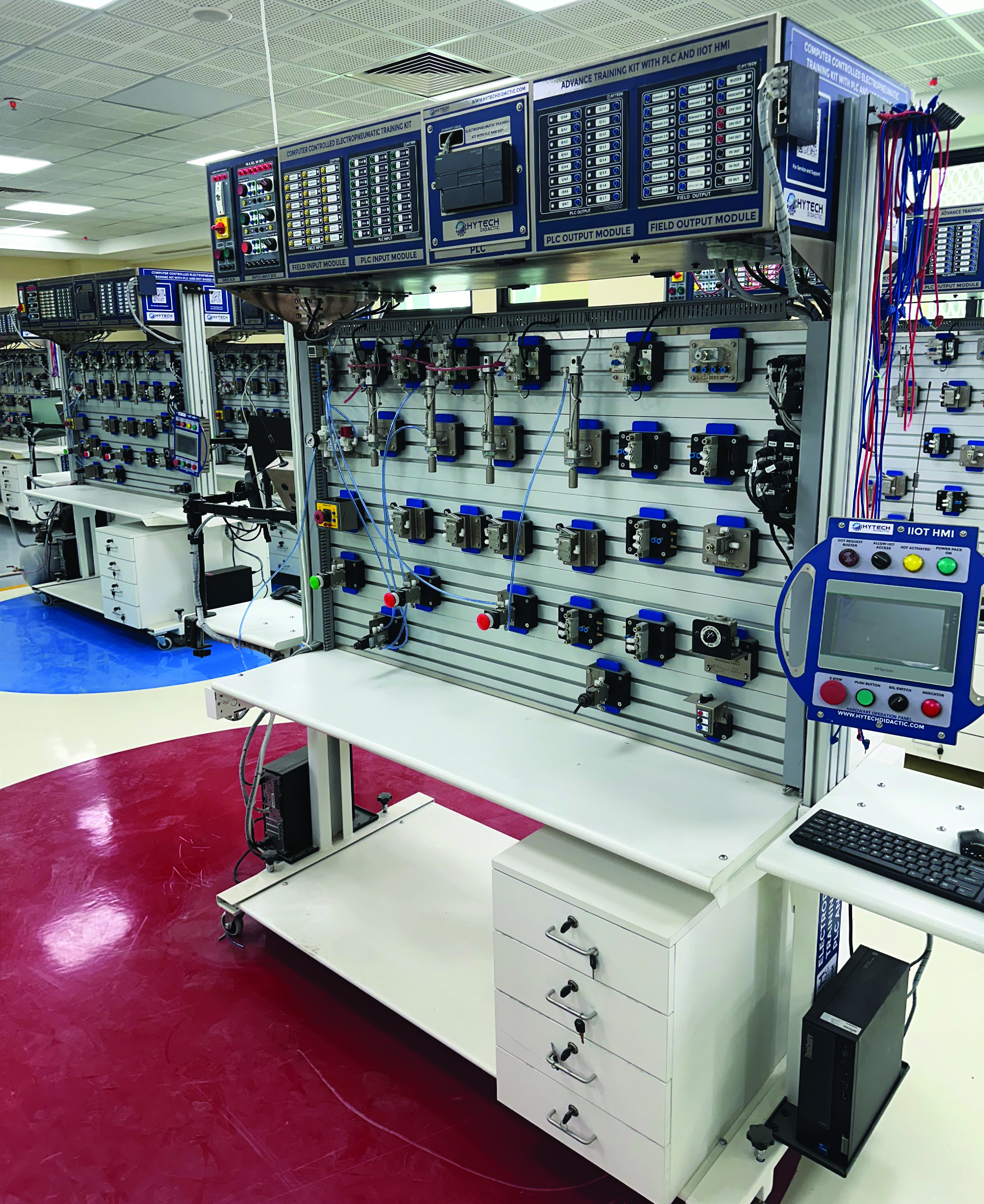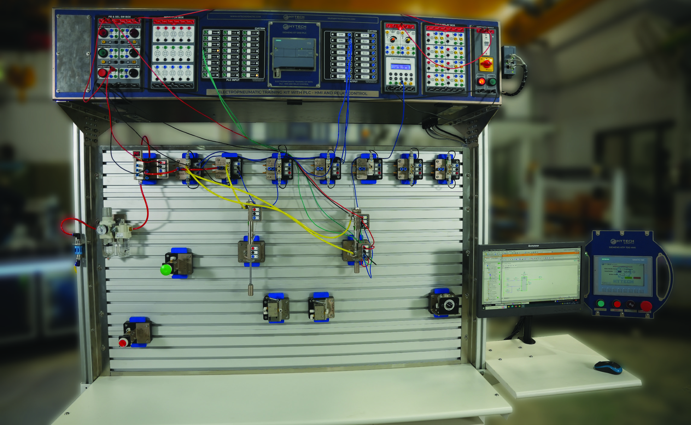Hytech Didactic Electropneumatic Training kit is mounted on a rigid Mild steel structure. The training kit is equipped with PLC, HMI as well as relay based operation modules. Control modules are made of industrial PCBs making the kit easy to operate as well as maintain.