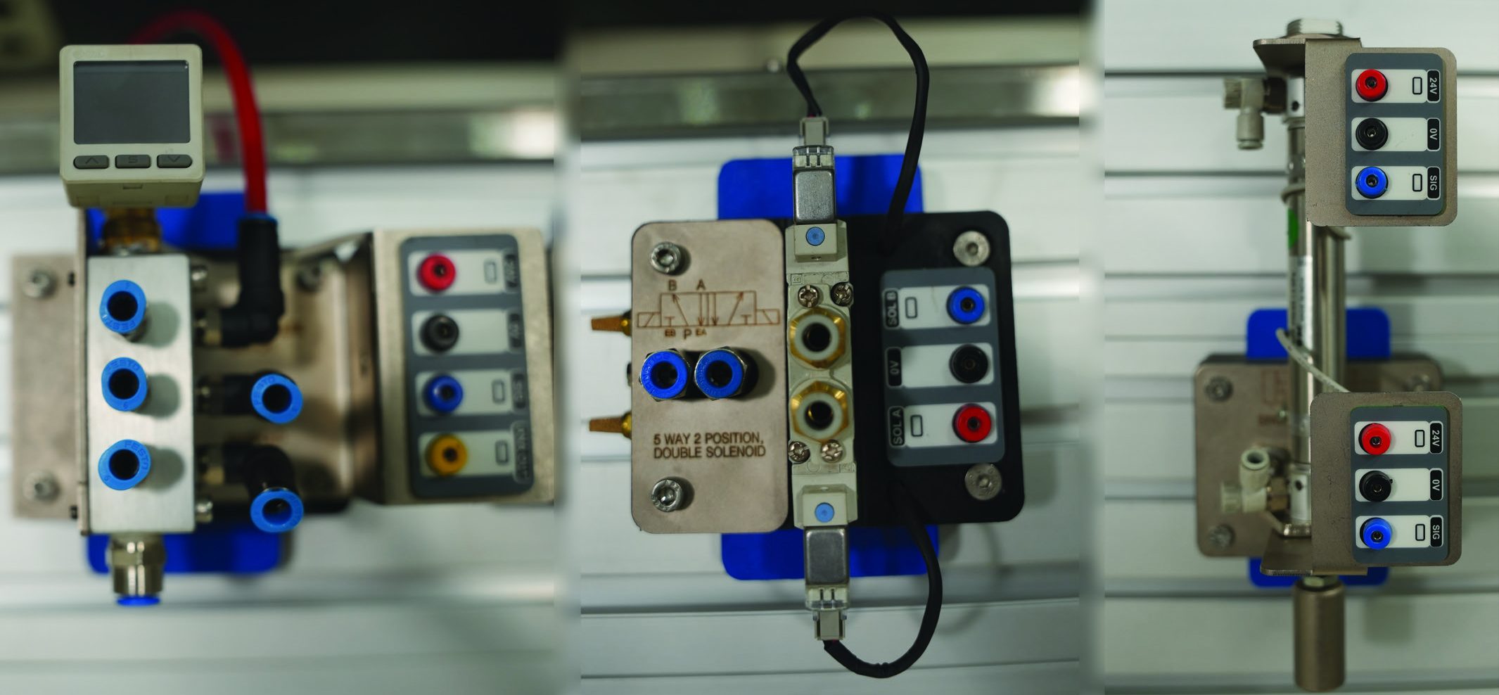 Electropneumatic training kit comes with a dual faced worksurface made up of aluminium extrusions. Quick fix mechanisms for all valves and actuators makes it easier for users to engage and disengage the valves from Training kit. Quick fix mechanism makes it easy for users to store valves in drawers provided along with training kit. Solenoid valves as well as Cylinders are provided with PCBs for electrical connections.