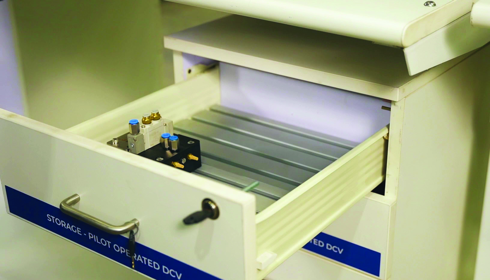 Electropneumatic training kit is provided with a pedestal with minimum 3 drawers on both sides of the training kit. Drawers are equipped with aluminium profiles on which the valves can be mounted and stored with the help of quick fix mechanism.